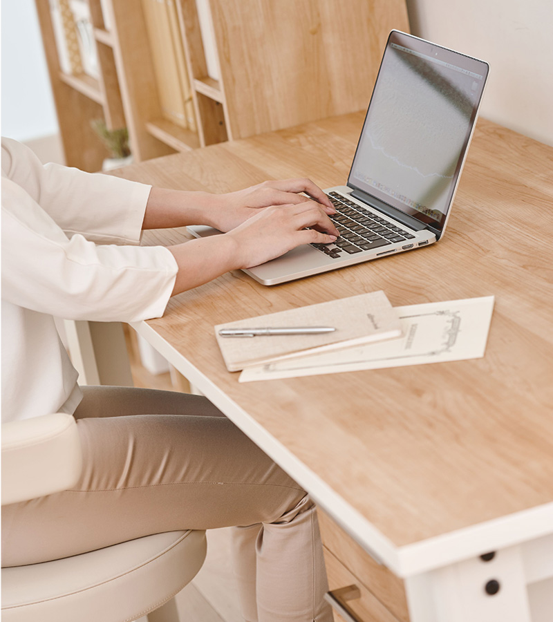 また、高度な印刷加工技術によって、立体的でリアルな木目の風合いを再現しています。触れて感じる心地よさ、実用性を兼ね備えたこのデスクは、長時間のパソコン作業や多様なシーンにおいて、使う人の負担を和らげ、快適な時間へと導きます。