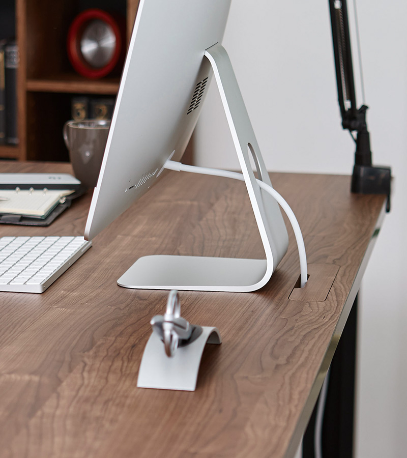 さらに、天板裏にはコード受けを装備。余ったコードをまとめて収納できる構造になっています。コードは天板裏の縁に沿わせて脚の内側へと配線でき、途中でクランプによってしっかり固定できます。足元まできれいに整い、見た目も気持ちもクリアに。コードに煩わされることなく、すっきりとした理想的な環境が整います。
