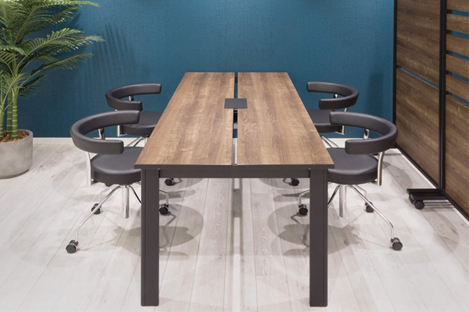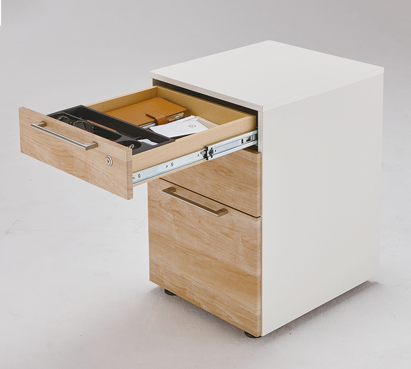 デスクのほか、キャスター付き収納ワゴンやシェルフなどのアイテムに加え、オフィスで活躍するミーティングテーブルやパーテーションまで、多彩に展開しています。オプションの引出を追加したり、デスクをL型に連結したりと、用途や空間に合わせて柔軟に拡張できるのも特長です。